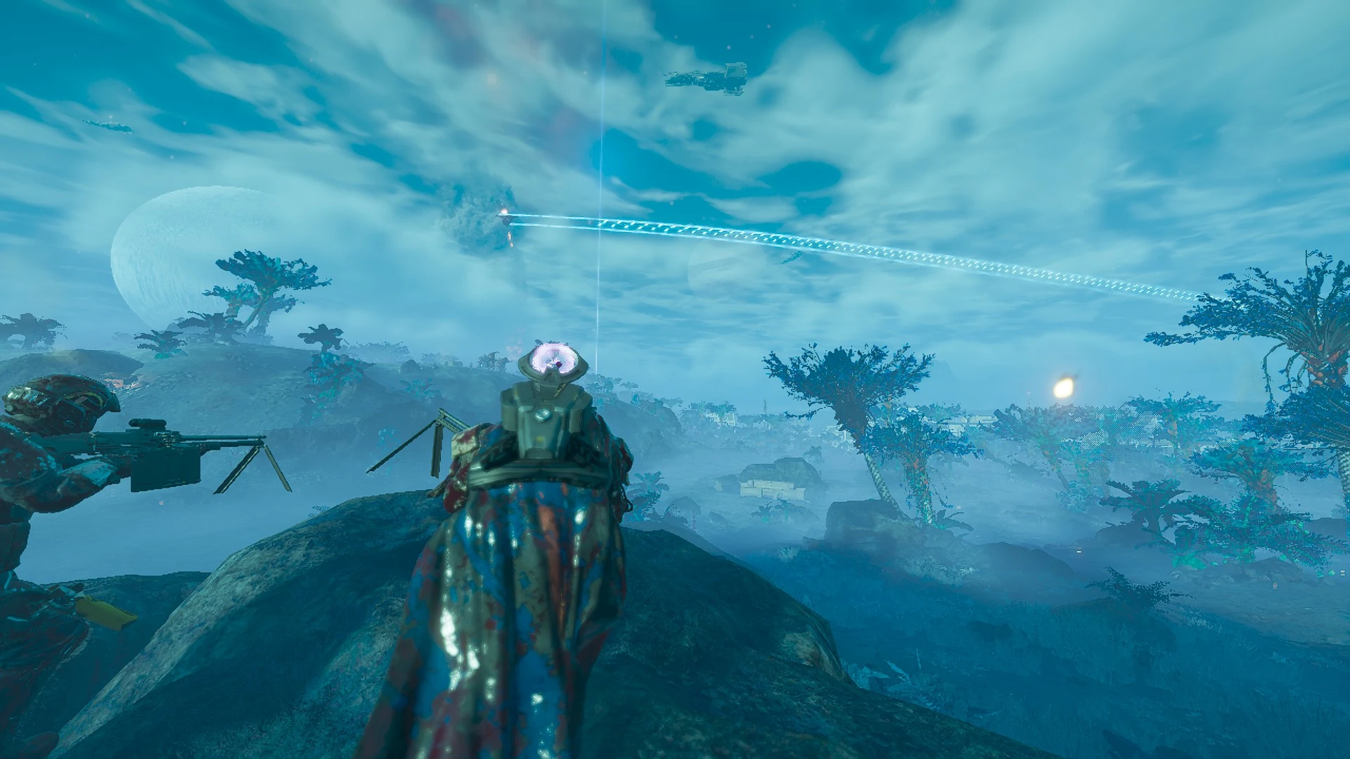 Two Helldivers scout ahead of their position as they watch an Illuminate Stingray flyby. October 7th, 2185.