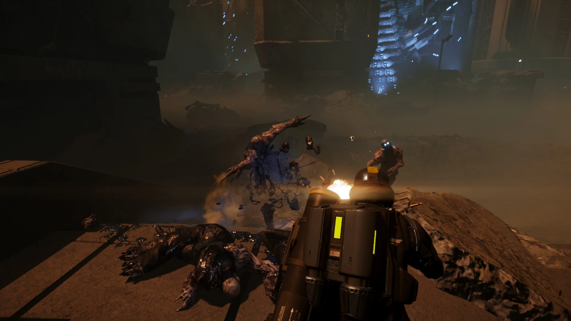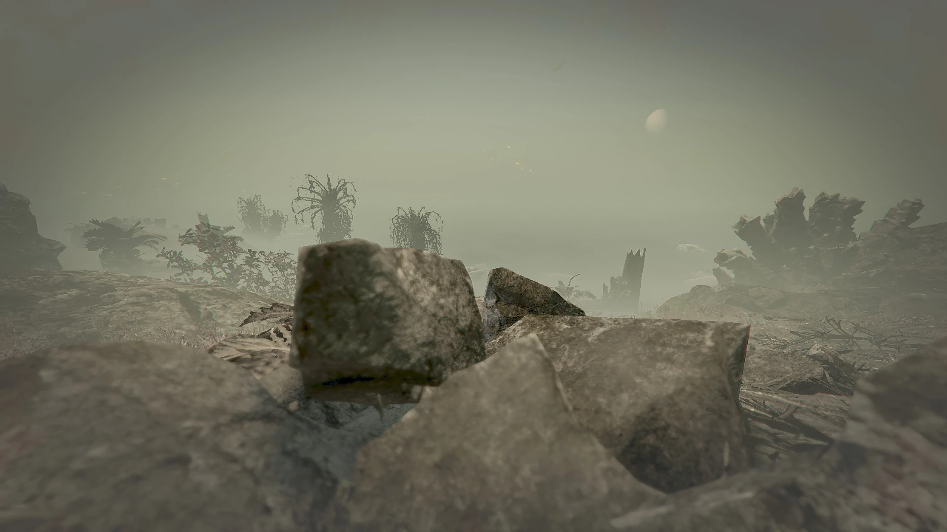 The ash in the planet is dense enough to limit visibility to a considerable amount, creating periods of thick fog that will make it difficult to engage hostiles at large distances. Certain forms of xenoflora can be found; such as Cluster Bushes, which are small bushes consisting of a stem and bulb-like fruits growing out of it that, when shot or disturbed by explosions, violently release barbs in all directions and deal damage similar to grenade shrapnel.