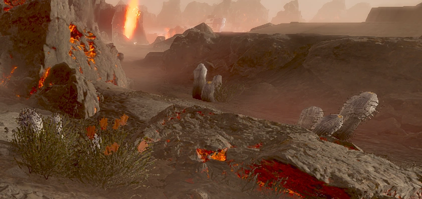 Particular types of xenoflora that can be found in this biome include a certain bush with green bioluminiscent flowers. Additionally, an unlisted effect is that these planets will often have a random level of volumetric fog, product of the fumes that routinely pour out of the surrounding plateaus. However, this fog is often so minimal it does not hinder visibility.