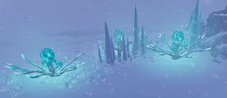 A form of xenoflora present in both Arctic Biomes are plants that will be colloquially referred to as Space Artichokes. Alternatively referred to as Frost Flowers, Polar Bulbs or Ice Plants; Space Artichokes are, as the name might imply, plants with a striking resemblance to terrestrial artichokes that glow with a bright cyan hue and, when touched or disturbed in any way, violently explode. This explosion only delivers a minor amount of damage (15 points of Explosive Damage, to be precise) but will apply a 3-second stun effect similar to that of an AR-32 Pacifier gunshot. Additionally, the explosion will leave behind a cloud of residue that will apply this stun effect onto any entity that comes into contact with it. This cloud of residue vanishes after approximately 15 seconds, though it may last longer if multiple space artichokes explode close to one another.