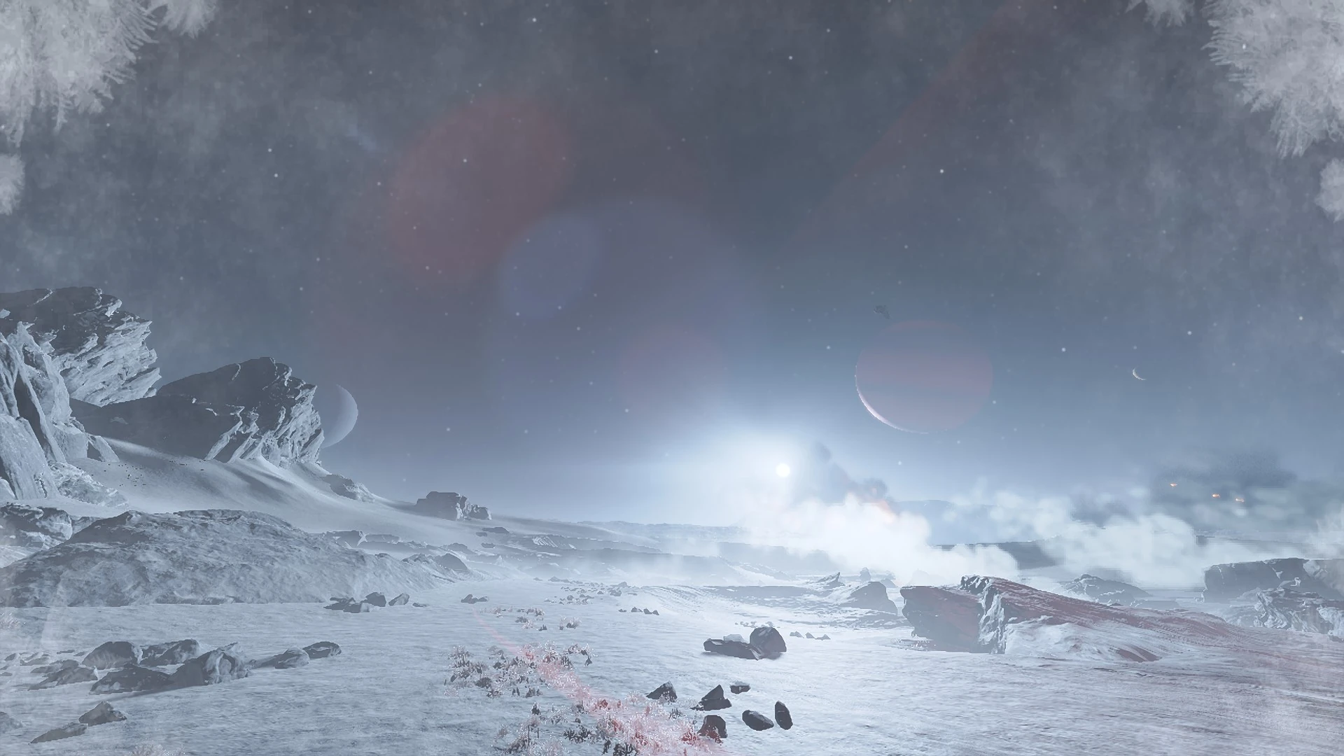 Similar to Maia and Curia, old, rocky moon. Its topography is composed of a cratered, hilly landscape with occasional cliff formations. It is entirely grayscale, possessing little to no color other than non-natural structures. Its terrain, while hilly, is quite open, making it relatively easy to traverse. This also provides excellent long-distance visibility.