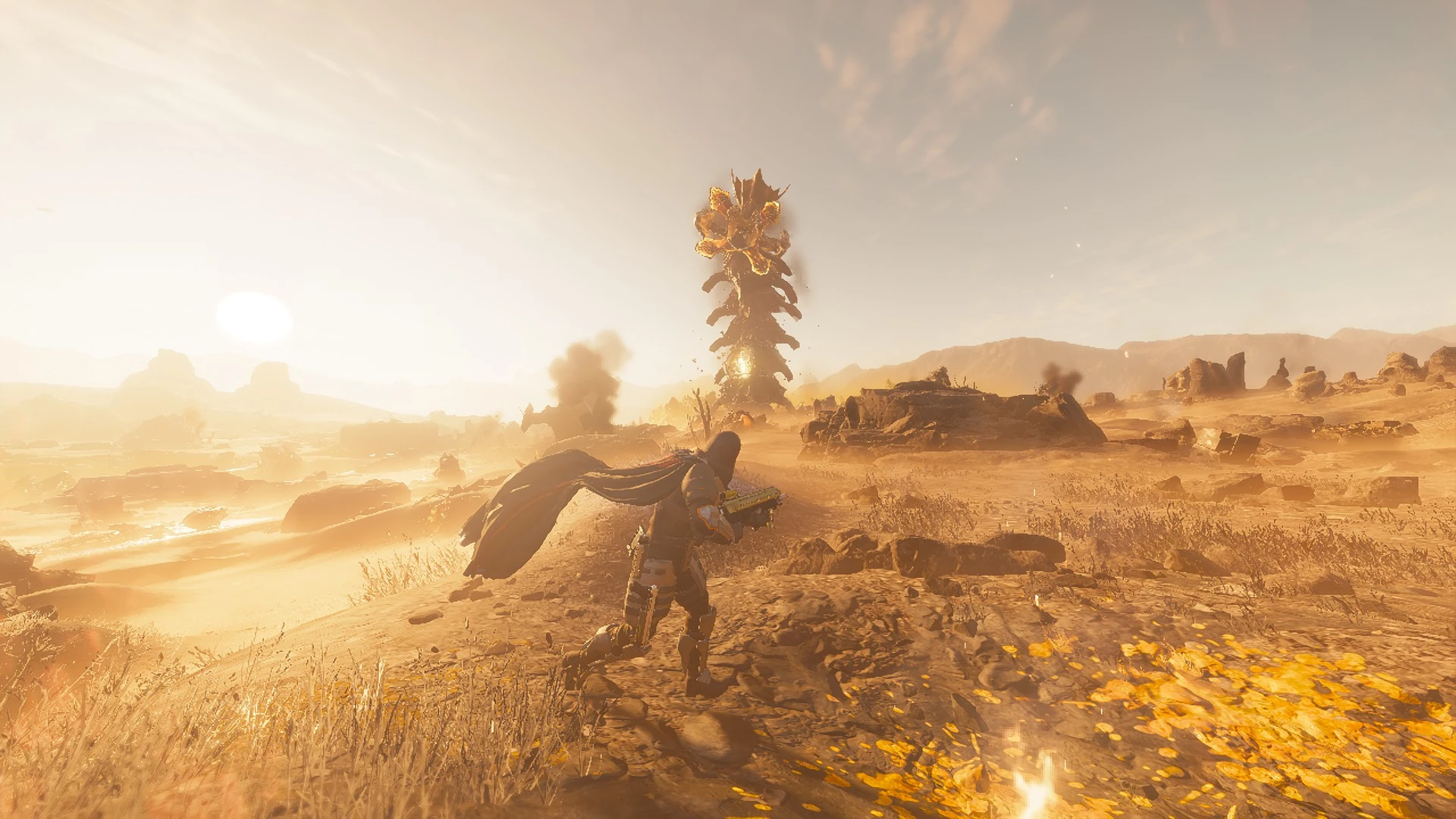 Fire tornadoes form frequently in the planet's scorching atmosphere, incinerating humans and Terminids indiscriminately. It is theorized that the little plant life that manages to survive on Hellmire uses the tornadoes to germinate, similar to some plants species on the southern continent of Sector One. The deserts of Hellmire are divided by narrow, craggy canyons that may hamper movement.
