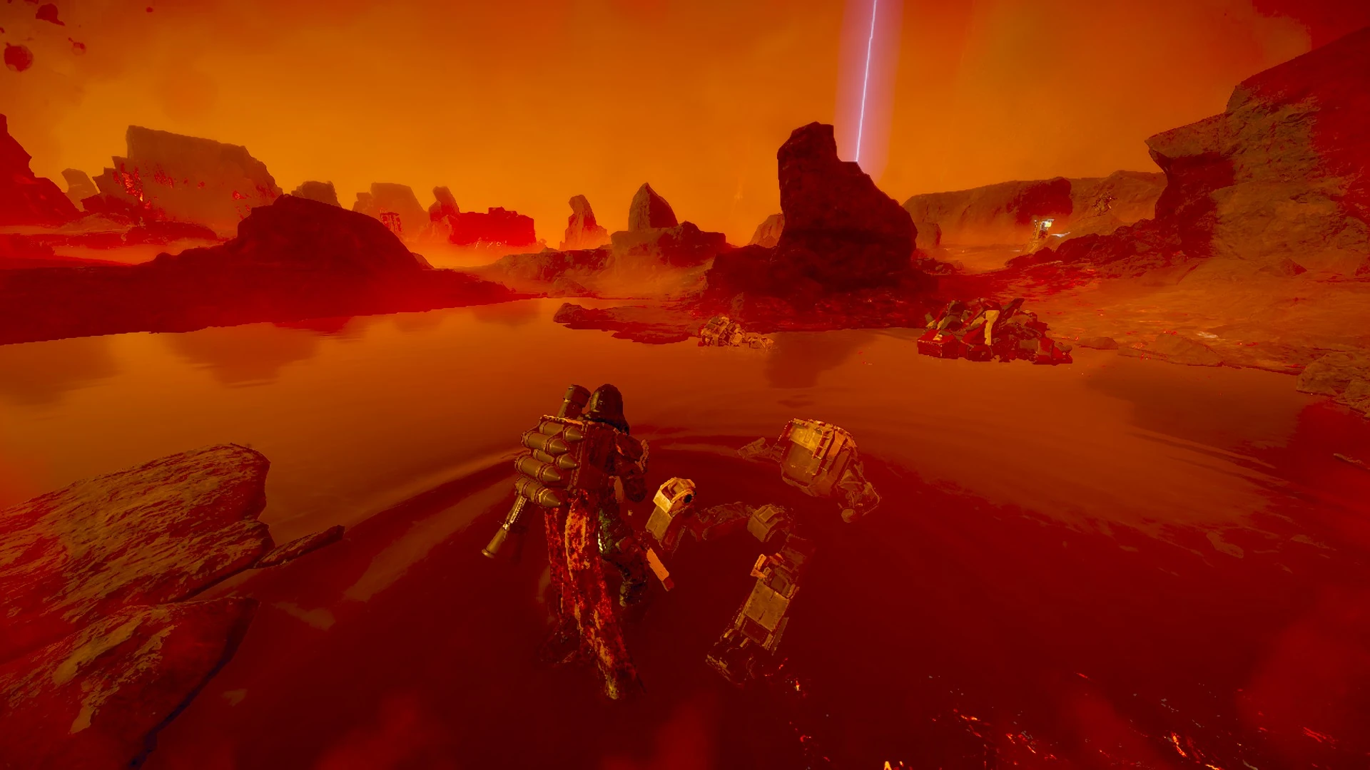 A wounded Helldiver contemplates an odd pond on K's surface after battling against the Automatons. December 4th, 2185.