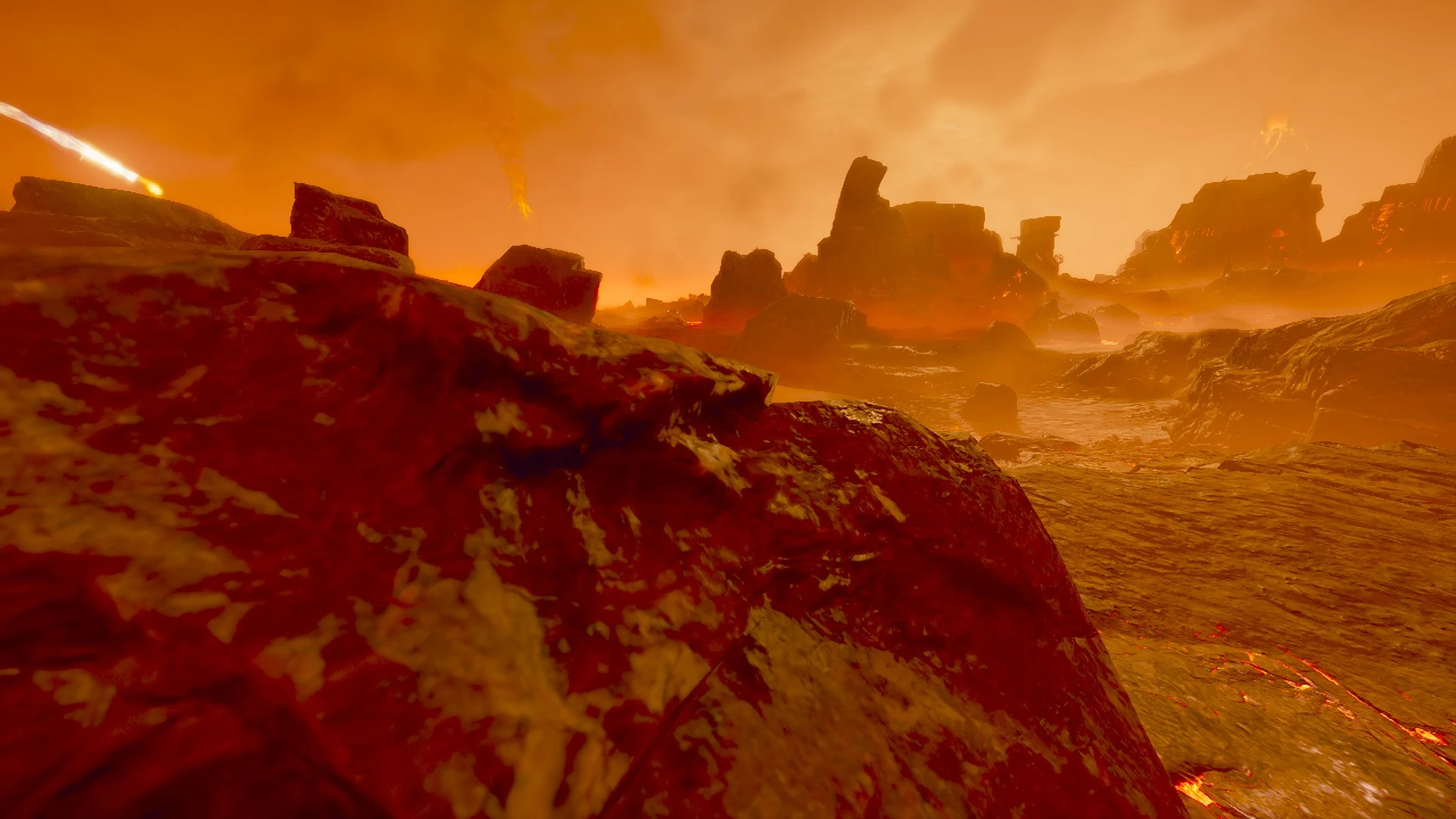 Ministry of Expansion as one of many "Magma Planets". An infernal hellscape, where the scorched wastelands are dotted by lakes of blazing lava and bisected by snaking rivers of magma. Active volcanoes spread as far as the eye can witness the flow of precious molten minerals dribbling down the blackened dirt of the planet's supercontinental landmass, with smaller geysers and magma ponds being a common sight and an even more ordinary threat due to their constant eruptions.