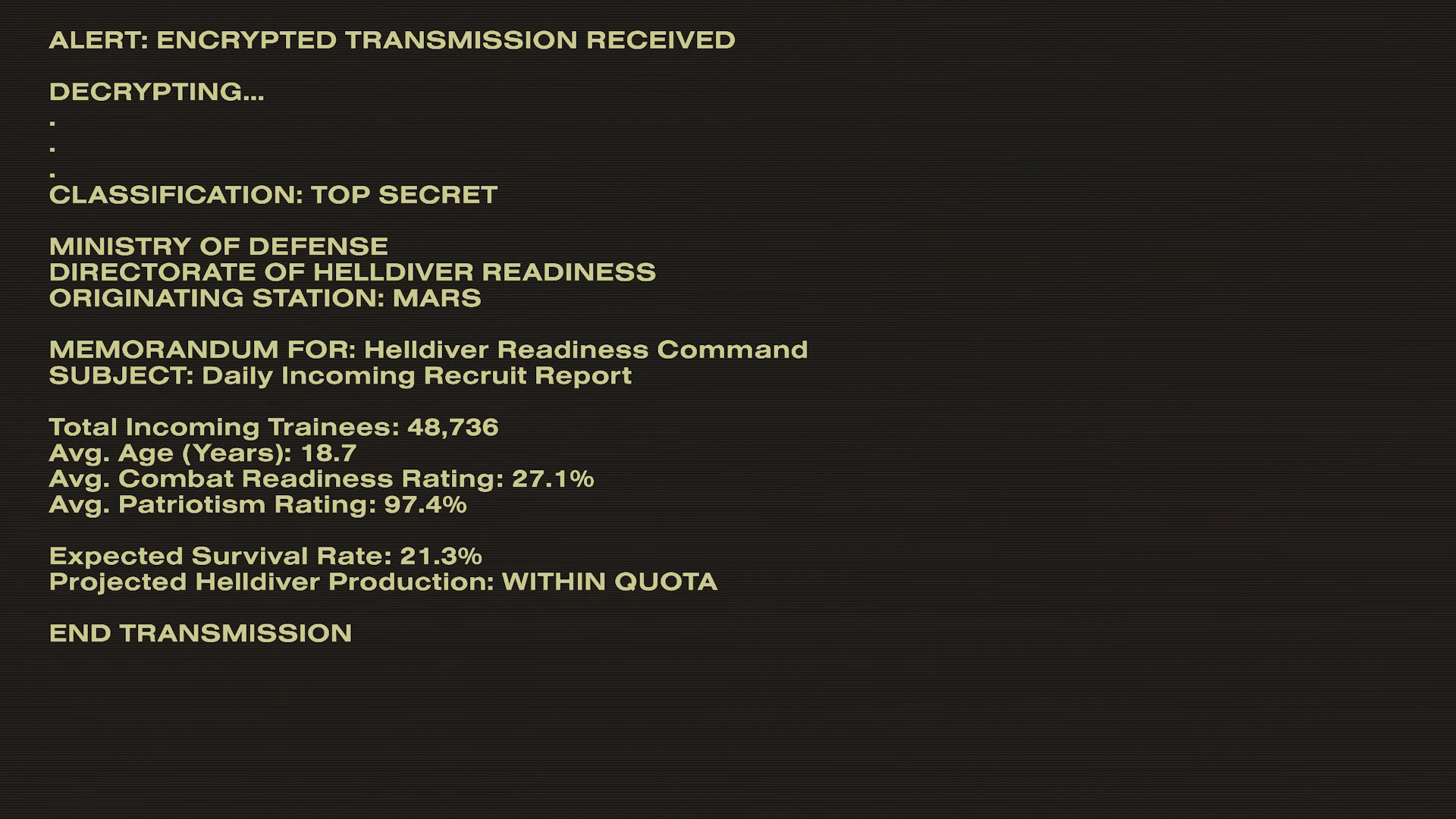 Helldiver training facilities and shipyards had been relocated to an undisclosed planet, though a number of personnel were killed in the attack, among them the expert and seasoned facility PA operators who had once facilitated the training facilities. Though the destruction of Mars was a devastating blow, it was only a prelude to the real horror: with the