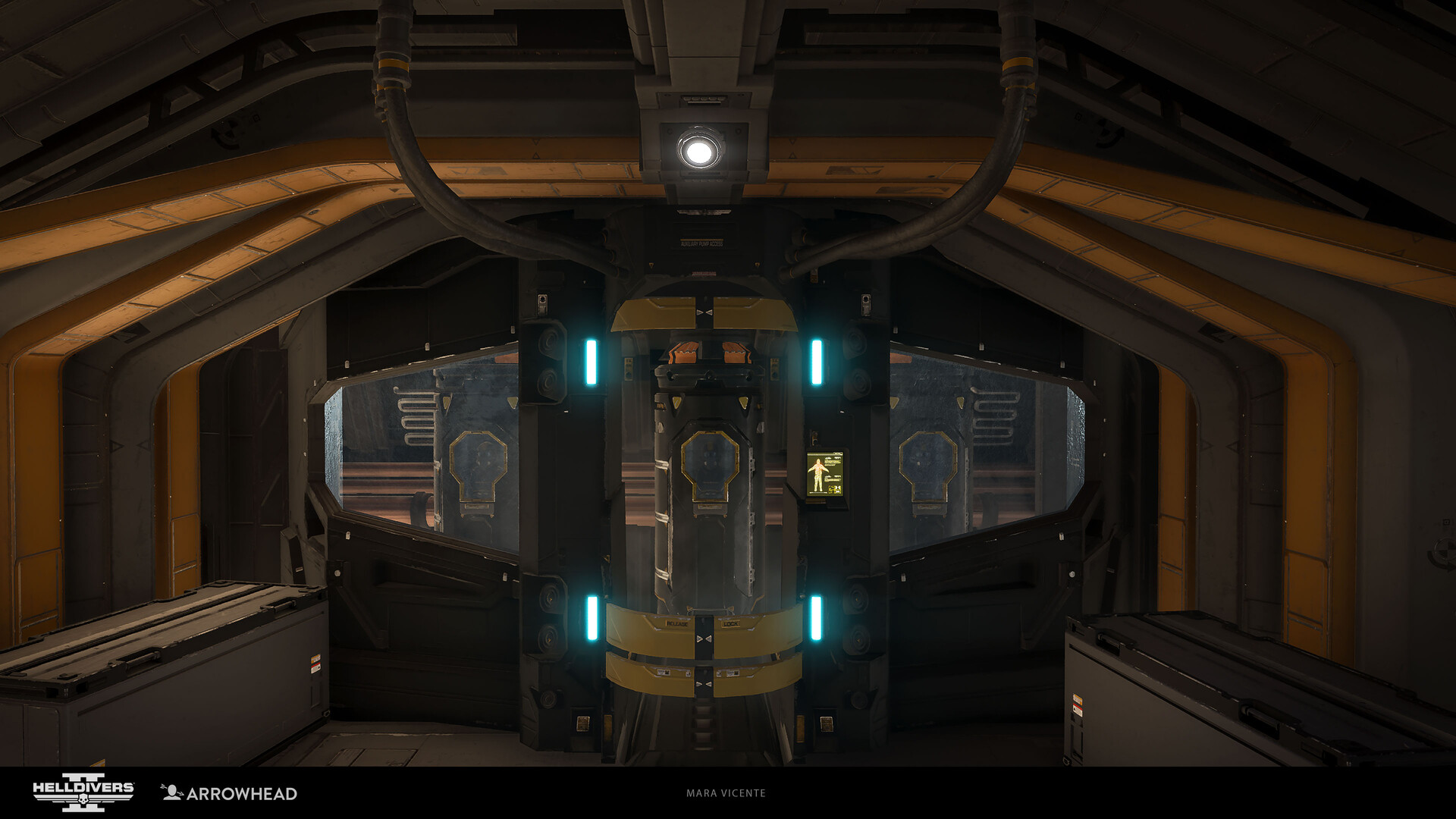 Helldiver to enter the main deck. Helldivers from allied vessels can also return here to be re-frozen and transferred back to the ships they command. Additionally, two belts of artillery ammunition run along the ceiling of the bridge.
