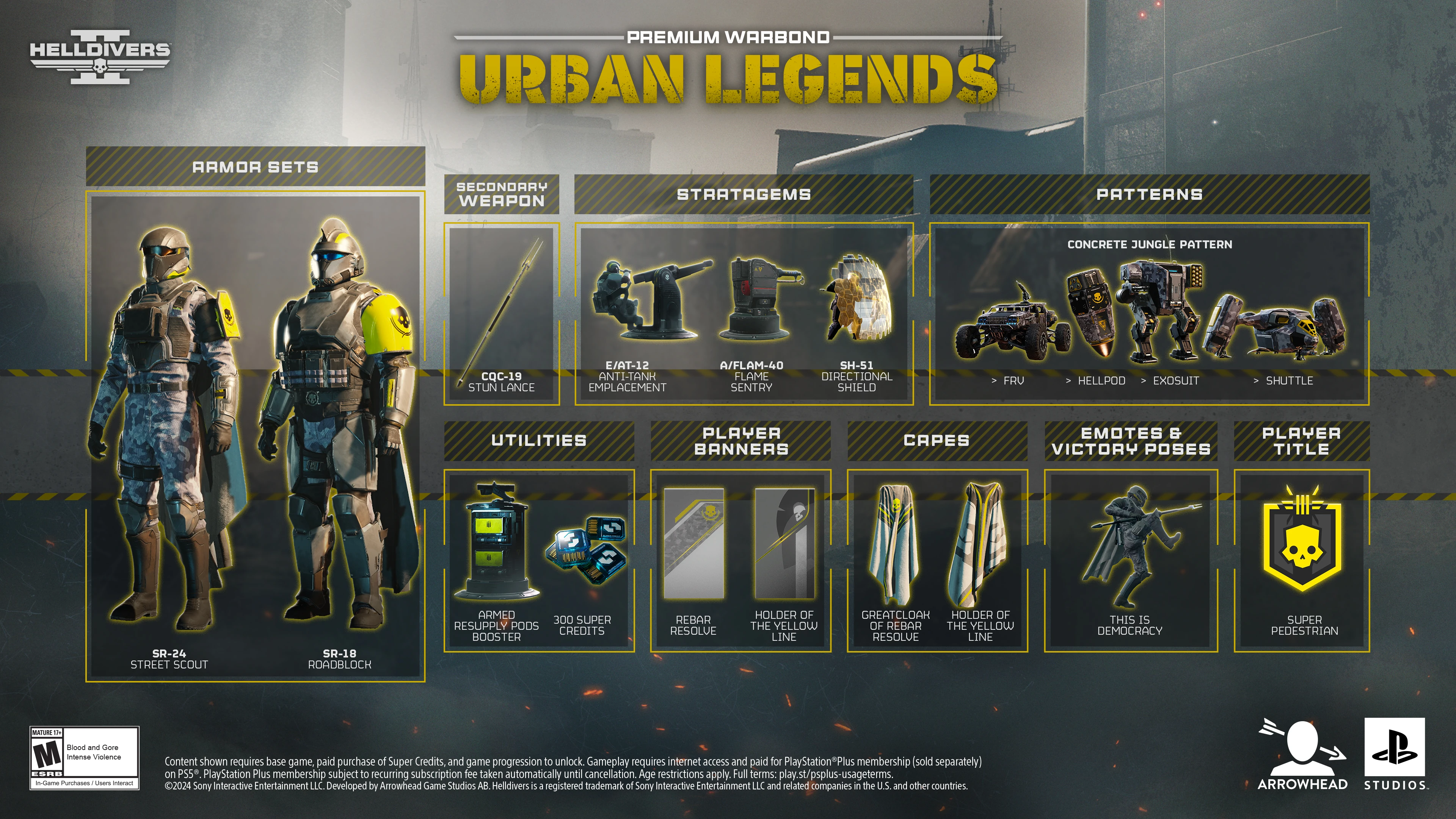 Urban Legends, released on December 13th 2024, is the ninth Premium Warbond available in Helldivers 2. Like the other Premium Warbonds, it has three pages and costs 1000 Super Credits to unlock.